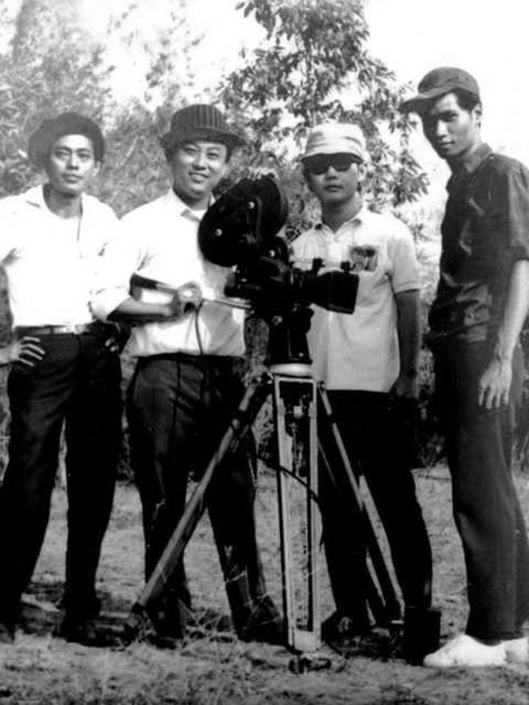 ภาพ: ปง อัศวินิกุล (ที่สองจากขวา) กับกล้อง Arriflex ที่ซื้อมาใช้งาน และ ก้องเกียรติ อัศวินิกุล (สวมแว่นดำ) หลานชายที่เป็นตากล้องถ่ายหนัง