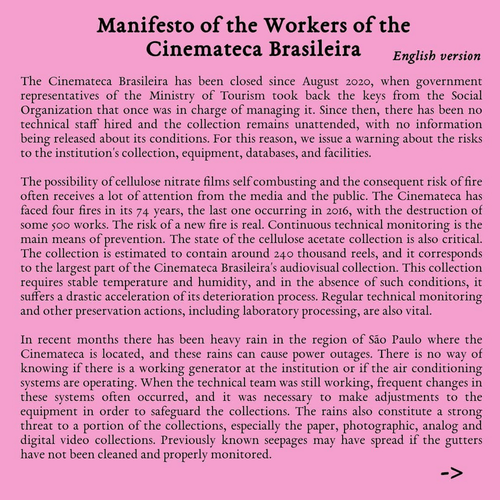 “ผ่านมาแล้วกว่า 8 เดือนที่ไม่มีเจ้าหน้าที่ผู้เชี่ยวชาญเฉพาะทาง ฝ่ายรักษาความปลอดภัยและอัคคีภัย รวมถึงนักอนุรักษ์ภาพยนตร์ผู้สามารถดูแลรักษาสิ่งของภายใน ทุกวันนี้เราต้องกลายมาเป็นประจักษ์พยานต่อโศกนาฏกรรมที่เกิดขึ้นกับเอกสารภาพยนตร์หายาก ภาพยนตร์ข่าว และภาพยนตร์เรื่องสำคัญของประเทศจำนวนมาก พวกเรากลัวเหลือเกินว่า สังคม ประวัติศาสตร์ วัฒนธรรม และภาพยนตร์ของประเทศบราซิลจะสูญสลายลงในอีกไม่ช้า”