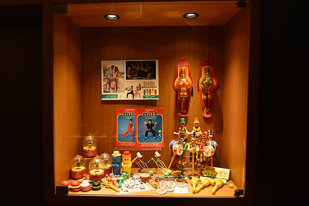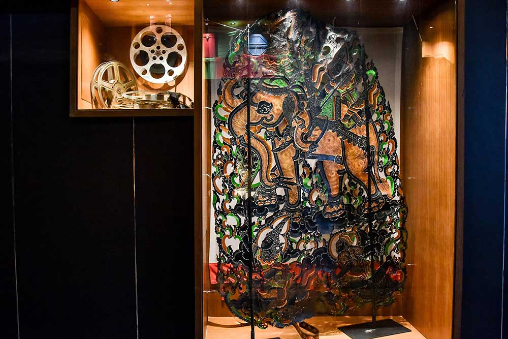 กระทั่งมีสิ่งประดิษฐ์ที่พัฒนาการไปตามลำดับเวลา อาทิ โคมกายสิทธิ์ (Magic Lantern) หรือเครื่องมือที่ใช้สำหรับฉายแสงเล่นเงาบนจอด้วยกระจกที่ผ่านการเขียนรูประบายสี มหรสพเช่นนี้ในสมัยกรุงรัตนโกสินทร์เรียกว่า “โคมเชิดหนัง” อีกจุดหนึ่งที่โดดเด่นคือ หนังสัตว์ที่ถูกตัดฉลุเป็นรูปต่าง ๆ เล่นเป็นละครเงา (Shadow Play) หรือที่เรียกกันอย่างคุ้นหูว่า หนังตะลุง ละครเงาที่คล้ายกันคือ หนังใหญ่ ที่มีตัวเชิดใหญ่กว่าหนังตะลุงเป็นมหรสพชั้นสูงที่มีมาแต่สมัยรัชกาลที่ 5 ตัวเชิดหนังใหญ่ตามที่ปรากฏในตู้จัดแสดงคือเรื่องราวของพระอินทร์และช้างเอราวัณ สร้างสรรค์จากงานสืบสานหัตถศิลป์โบราณของวัดขนอน จังหวัดราชบุรี เพื่อนิทรรศการนี้โดยเฉพาะ
