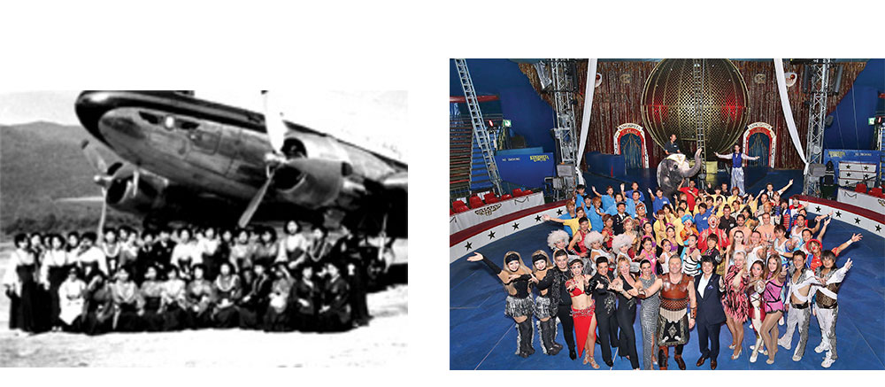 ภาพ: (ซ้าย) ภาพบันทึกก่อนการเดินทางมาทำการแสดงในไทย (จากเว็บไซต์คณะละครสัตว์กิโนชิตา) (ขวา) คณะละครสัตว์กิโนชิตาในสมัยปัจจุบัน (จากเพจ 団馬曲大下木 Kinoshita Circus)