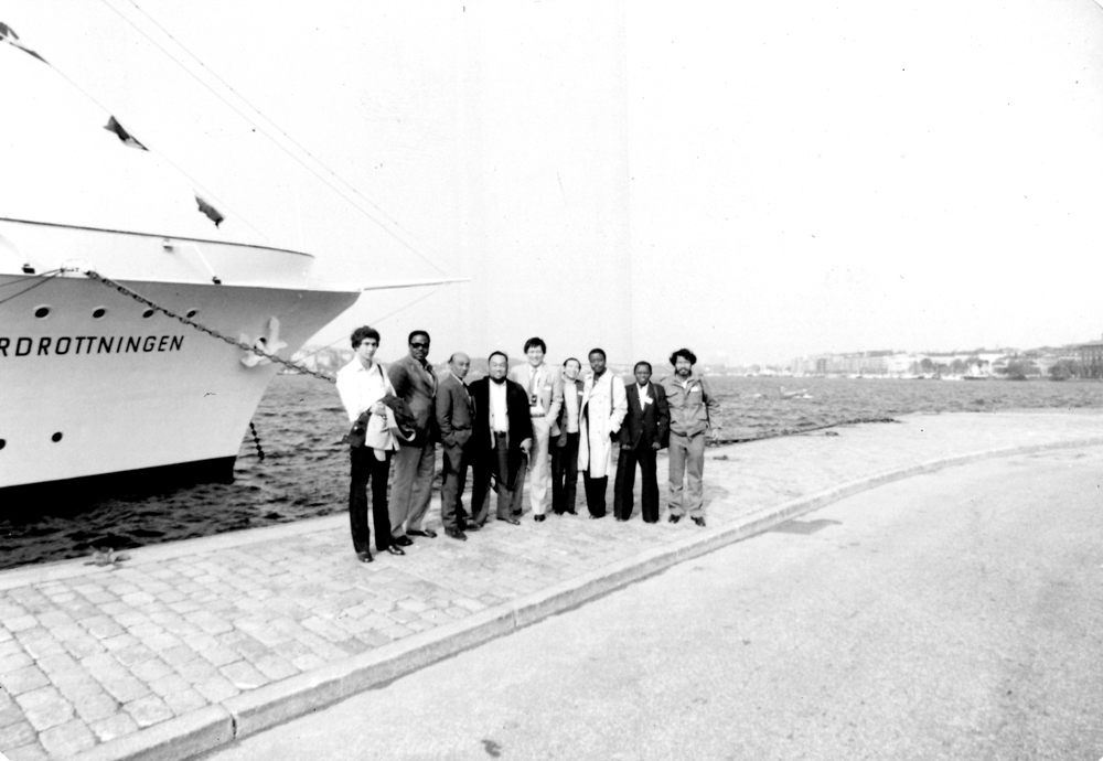 ภาพ: โดม สุขวงศ์ (ขวาสุด) กับผู้แทนจากประเทศกำลังพัฒนาที่ได้รับเชิญไปร่วมงานประชุมใหญ่ของ สมาพันธ์หอภาพยนตร์ระหว่างชาติ เมื่อ พ.ศ. 2526