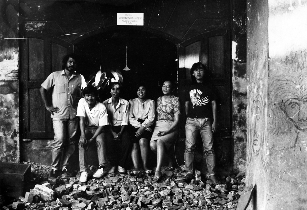 ภาพ: เจ้าหน้าที่หอภาพยนตร์ชุดแรก (จากซ้ายไปขวา) โดม สุขวงศ์, สมชาติ บางแจ้ง, ศักดินา ฉัตรกุล ณ อยุธยา, วัลภา ขวัญยืน (หัวหน้าพิพิธภัณฑสถานแห่งชาติ หอศิลป), เพ็ญพรรณ เจริญพร และ ประสิทธิ์ ดีศิลปกิจ