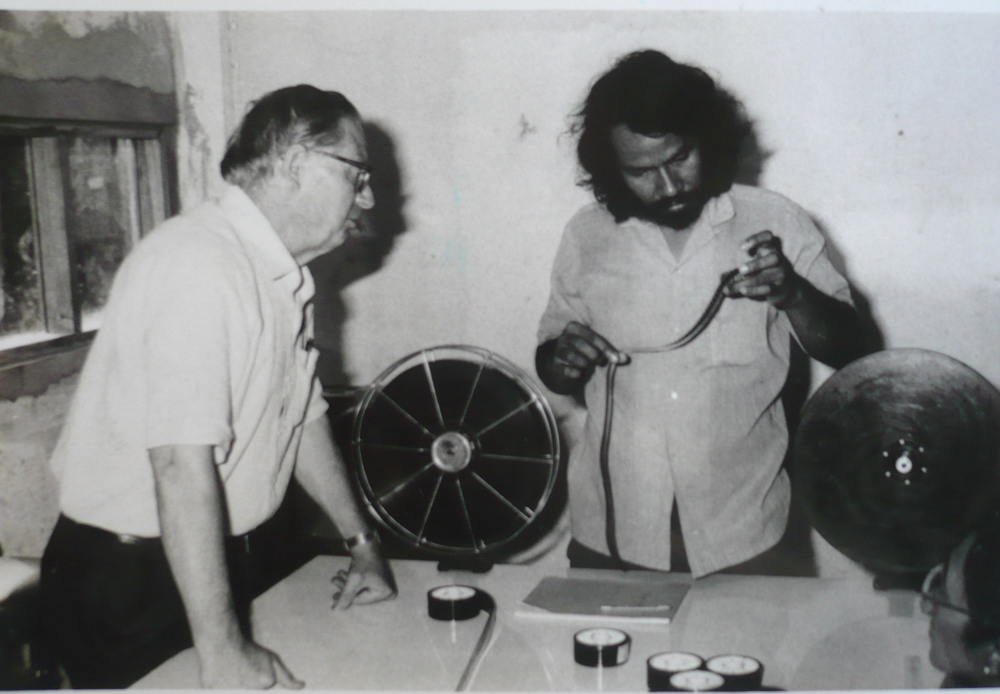 ภาพ: โดม สุขวงศ์ (หลังสุด) ขณะตรวจชำระฟิล์มเก่าหลายร้อยม้วน ร่วมกับ สุรพงษ์ พินิจค้า ที่การรถไฟแห่งประเทศไทย เมื่อ พ.ศ. 2524