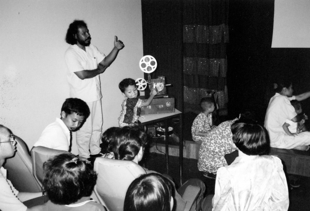 ภาพ: โดม สุขวงศ์ กับเด็ก ๆ ในงานวันกำเนิดภาพยนตร์ในสยาม ปี 2532 ที่โรงหนังอลังการ หอภาพยนตร์แห่งชาติ