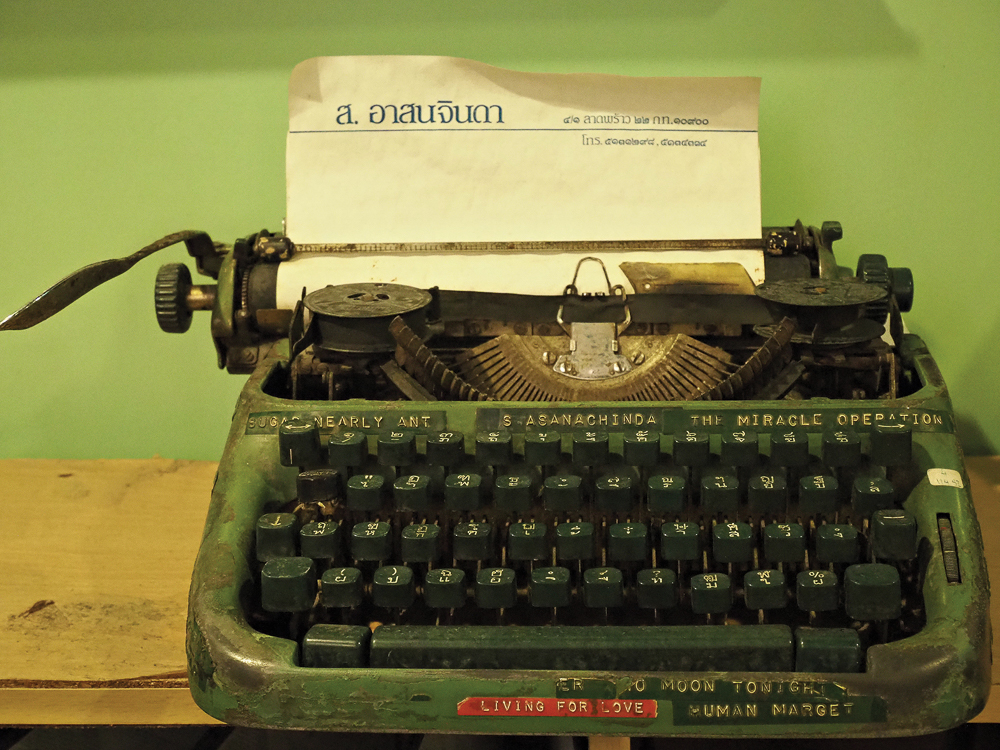 ภาพ: พิมพ์ดีดคู่กายที่ ส. อาสนจินดา ใช้เขียนหนังสือและบทภาพยนตร์หาเลี้ยงชีวิต จัดแสดงอยู่ในพิพิธภัณฑ์ภาพยนตร์ไทย