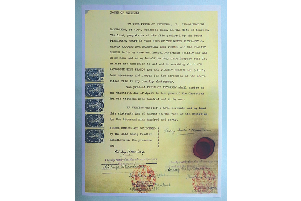ภาพ: เอกสารที่ ปรีดี พนมยงค์ มอบฉันทะให้ ม.ร.ว.เสนีย์ ปราโมช และ ประสาท สขุม เป็นผู้มีอำนาจในการเจรจาเผยแพร่ภาพยนตร์ พระเจ้าช้างเผือก ในประเทศต่าง ๆ