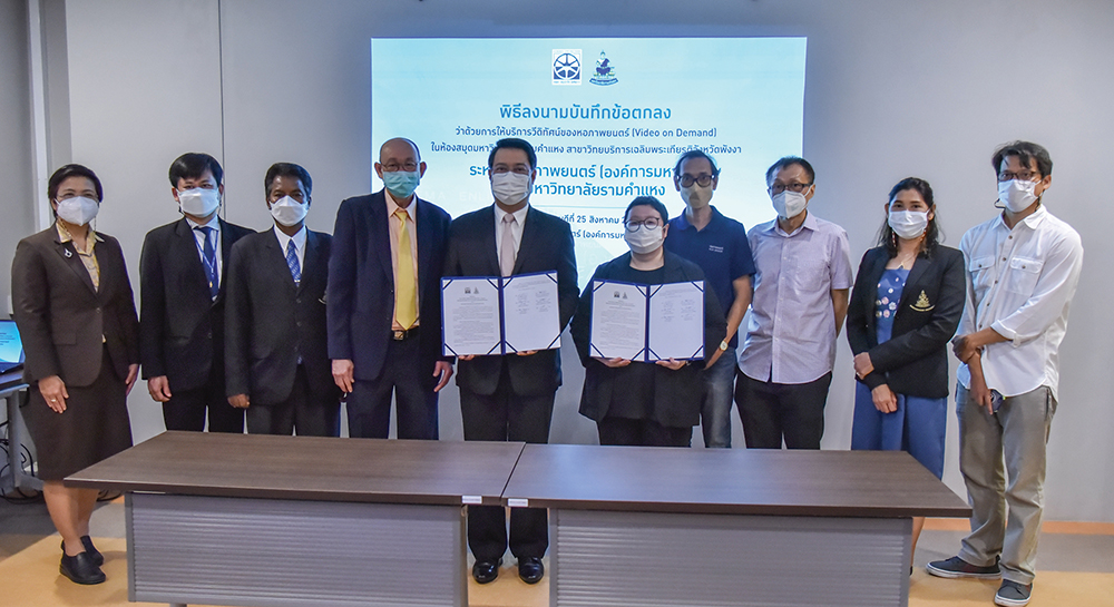 ภาพ: พิธีลงนามความร่วมมือกับมหาวิทยาลัยรามคำแหง เพื่อติดตั้งระบบให้บริการข้อมูลสื่อโสตทัศน์และสิ่งเกี่ยวเนื่องฯ ณ ห้องสมุดมหาวิทยาลัยรามคำแหง สาขาวิทยบริการเฉลิมพระเกียรติ จังหวัดพังงา