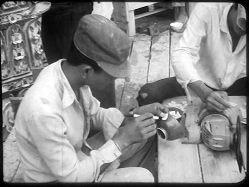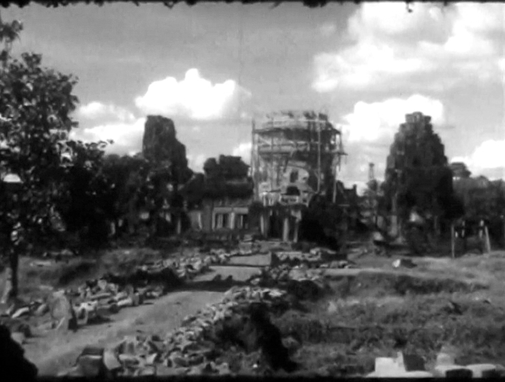 ภาพยนตร์ที่ได้บันทึกการบูรณะปราสาทหินพิมายเรื่องนี้อยู่ในชุด “มรดกของไทย” โดยบริษัท เอสโซ่ (ประเทศไทย) จำกัด (มหาชน) เป็นภาพยนตร์ 16 มม. ขาวดำ เงียบ ความยาว 25.37 นาที ทีมงานได้ถ่ายทำขั้นตอนการทำงานต่าง ๆ ในช่วงปลายของการบูรณะ รอบนอกของปราสาทหลังกลางเป็นระเบียงคดซึ่งมีสภาพทรุดโทรมมาก ตัวนาคบนบันไดนาคก็ปรักหักพังเหลือแต่เสาเป็นระยะ ๆ บุคคลที่ปรากฏอยู่ในภาพยนตร์ที่เกี่ยวข้องกับการบูรณะปราสาท นอกจากเจ้าหน้าที่ของหน่วยศิลปากรพิมายแล้ว ยังปรากฏ แบร์นาร์ ฟีลิป โกรลีเย นักโบราณคดีชาวฝรั่งเศส ผู้มีส่วนร่วมอย่างสำคัญในการค้นคว้าและดูแลรักษาปราสาทนครวัด, หม่อมเจ้ายาใจ จิตรพงษ์ พระโอรสในสมเด็จพระเจ้าบรมวงศ์เธอ เจ้าฟ้ากรมพระยานริศรานุวัดติวงศ์ ซึ่งเป็นผู้มีความรู้ในศิลปะแขนงต่าง ๆ และได้รับหน้าที่ในการบูรณะปราสาทขอมหลายแห่ง เช่น ปราสาทหินพิมาย ปราสาทหินพนมรุ้ง รวมทั้งเป็นผู้ดูแลการบูรณปฏิสังขรณ์วัดพระศรีรัตนศาสดาราม เมื่อสมโภชกรุงรัตนโกสินทร์ 200 ปีด้วย บุคคลทั้งหลายเหล่านี้ร่วมกันทำงานบูรณะแข่งกับเวลา นายโกรลีเยและหม่อมเจ้ายาใจช่วยกันวัดสัดส่วนของหน้าบัน ซุ้มประตูมณฑป เพื่อที่จะหาลวดลายที่ปรักหักพังหลุดหายไป ซึ่งเมื่อหาได้ก็จะนำขึ้นไปปะติดปะต่อไว้ตามเดิม หากชิ้นส่วนหินก้อนไหนมีขนาดใหญ่ก็จะต้องเรียกให้คนมาช่วยกันยก แต่นอกจากใช้แรงงานคนแล้ว ก็ยังมีรถยกช่วยยกก้อนหินลวดลายต่าง ๆ ไปประกอบกันเพื่อประดับไว้ในจุดที่ถูกต้อง หินก้อนที่ตกลงมากองอยู่ที่พื้นก็จะเข้าไปตรวจสอบว่าควรเป็นส่วนประกอบของลวดลายตอนใด และเมื่อสำรวจแล้วก็จะเขียนหมายเลขกำกับไว้ ส่วนหินที่ต้องนำขึ้นไปที่ยอดปราสาทนั้น การจะนำกลับขึ้นไปประดิษฐานไว้ตามเดิม จะใช้วิธีเจาะหินให้เป็นรูเสียก่อน เมื่อเจาะรูแล้วจึงใช้เหล็กเสียบที่รูดังกล่าว และใช้ไม้สลักตอกลงไปอีกทีหนึ่ง ลวดเหล็กที่ใช้ไม้สลักตอกลงไปนี้ เมื่อใช้เครื่องกว้านกว้านขึ้นไปก็สามารถยกหินหนักนับร้อย ๆ กิโลกรัมขึ้นไปได้ นับเป็นความอุตสาหะพยายามของผู้มีส่วนร่วมในการบูรณะปราสาทหินพิมาย ภายใต้การดำเนินงานในขณะนั้นของหน่วยศิลปากรที่ 6 กรมศิลปากร (ปัจจุบันอยู่ในพื้นที่รับผิดชอบของสำนักศิลปากรที่ 10 นครราชสีมา)
