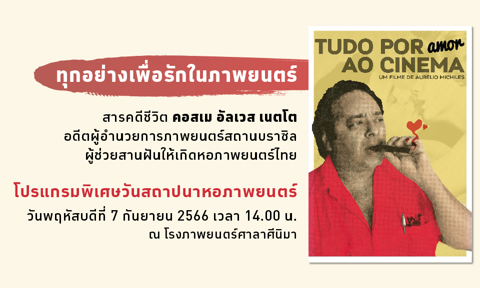 เนื่องในวันสถาปนาหอภาพยนตร์ วันพฤหัสบดีที่ 7 กันยายน 2566 เวลา 14.00 น. ณ โรงภาพยนตร์ศาลาศีนิมา หอภาพยนตร์ ขอเชิญชมภาพยนตร์สารคดีบราซิลปี 2558 กำกับโดย ออเรลิโอ มิชิลีส (Aurélio Michiles) เรื่อง Tudo Por Amor ao Cinema (All For the Love of the Movies) ที่บอกเล่าเรื่องราวชีวิตและการต่อสู้ด้วยความรักในภาพยนตร์ของ คอสเม อัลเวส เนตโต ผู้เป็นโซ่ข้อที่สองในการส่งต่อกระดาษสามแผ่น อันเป็นใบเบิกทางให้ โดม สุขวงศ์ ได้สานฝันและก่อร่างหอภาพยนตร์ในเมืองไทยให้เกิดขึ้นจริง สำรองที่นั่งได้ที่ <<คลิก>>