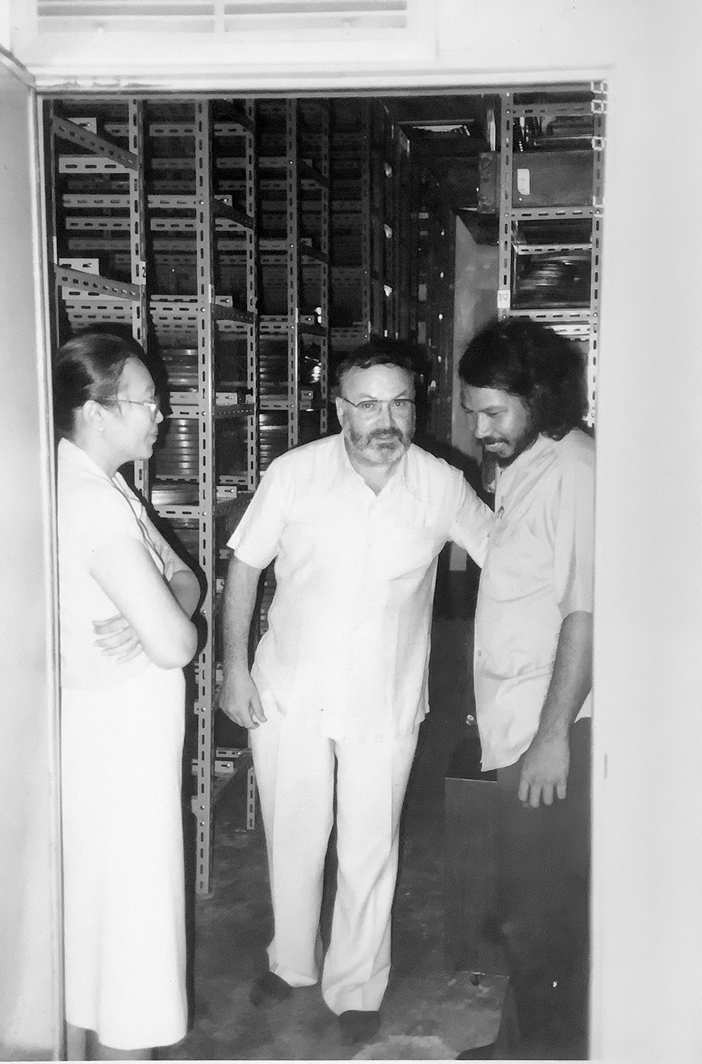 ภาพ: พ่อแอมบรอส กับ โดม สุขวงศ์ และ เพ็ญพรรณ เจริญพร ในห้องเก็บฟิล์ม หอภาพยนตร์ ถ. เจ้าฟ้า ปี 2529