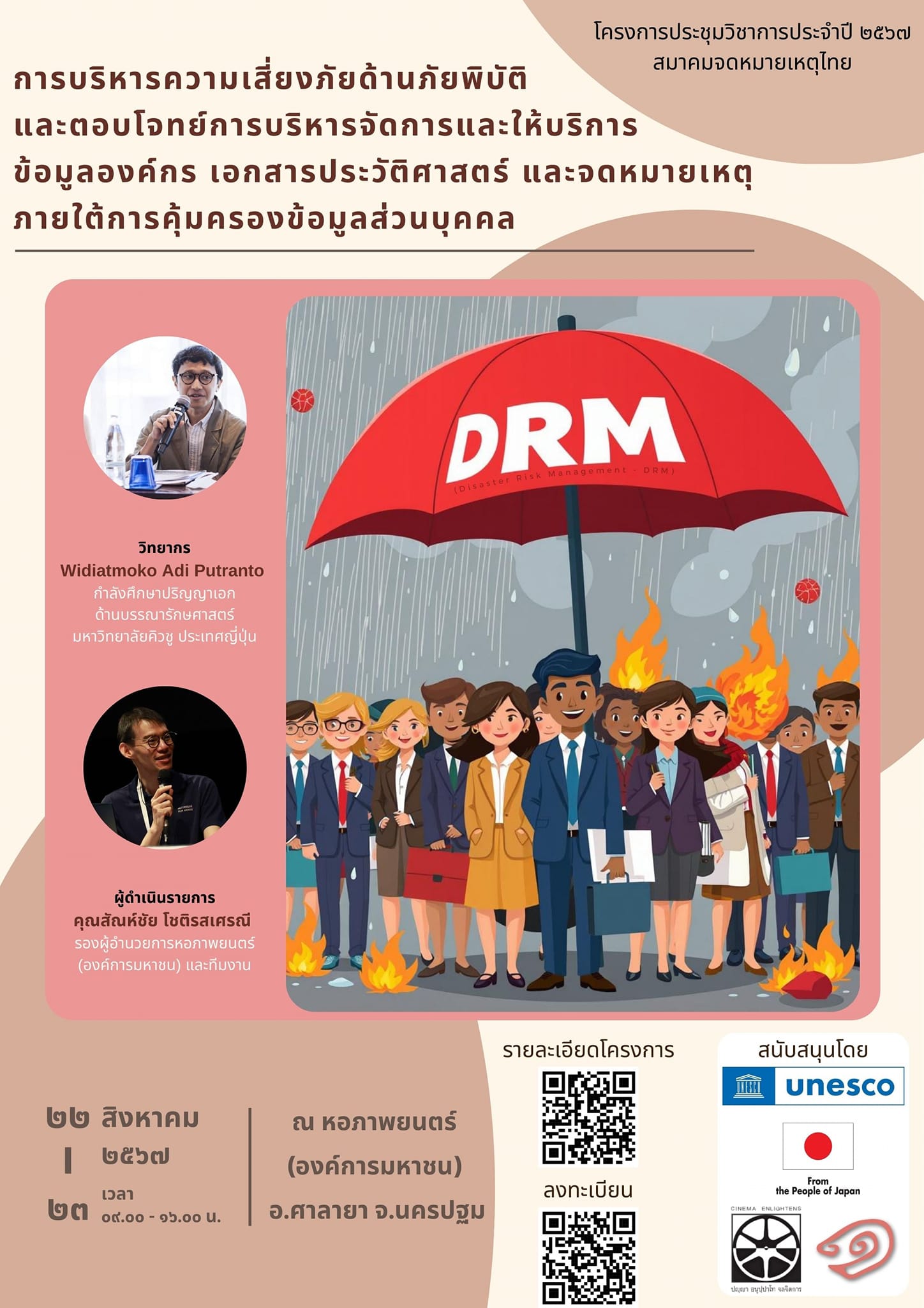 หอภาพยนตร์ (องค์การมหาชน) ร่วมกับ สมาคมหอจดหมายเหตุ โดยการสนับสนุนจากองค์การเพื่อการศึกษา วิทยาศาสตร์ และวัฒนธรรมแห่งสหประชาชาติ และรัฐบาลประเทศญี่ปุ่น จัดการอบรมการบริหารความเสี่ยงภัยด้านภัยพิบัติ (Disaster Risk Management) ใน วันพฤหัสบดีที่ 22 สิงหาคม พ.ศ. 2567 ณ หอภาพยนตร์ (องค์การมหาชน) ซึ่งเป็นส่วนหนึ่งของโครงการประชุมวิชาการประจำปี 2567 ของสมาคมจดหมายเหตุไทย