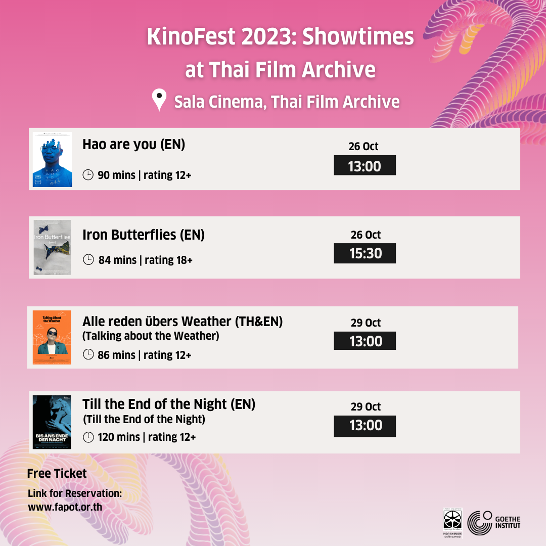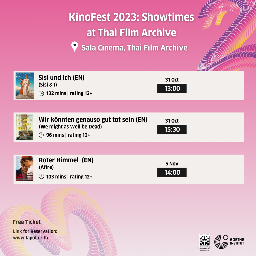 เทศกาล KinoFest เป็นเทศกาลภาพยนตร์ประจำปีโดยความร่วมมือระหว่างสถาบันเกอเธ่ ประจำภูมิภาคเอเชียตะวันออกเฉียงใต้ที่จัดขึ้นเพื่อฉายภาพยนตร์เยอรมันร่วมสมัย ปีที่แล้วเทศกาล KinoFest จัดขึ้นในรูปแบบออนไลน์เนื่องด้วยสถานการณ์โควิด 19 แต่สำหรับเทศกาล KinoFest ในปีนี้จะจัดขึ้นในโรงภาพยนตร์ของสถาบันเกอเธ่และโรงภาพยนตร์พาร์ทเนอร์หลายแห่งทั่วประเทศ