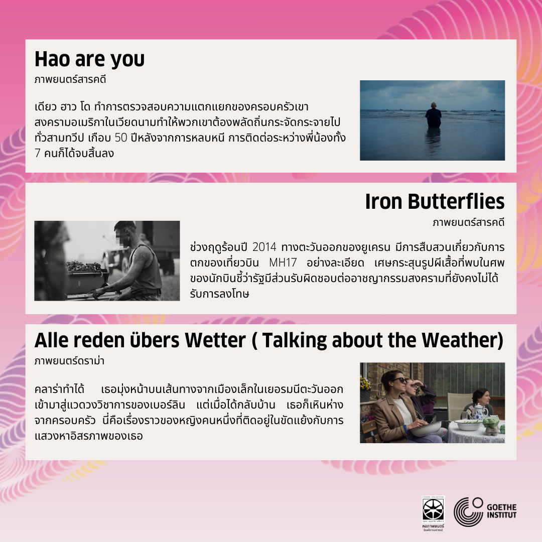 อ่านข้อมูลเกี่ยวกับแนวคิดและการคัดสรรภาพยนตร์ของภัณฑารักษ์ได้ที่ https://www.goethe.de/ins/th/th/kul/sup/kin/ktt.html