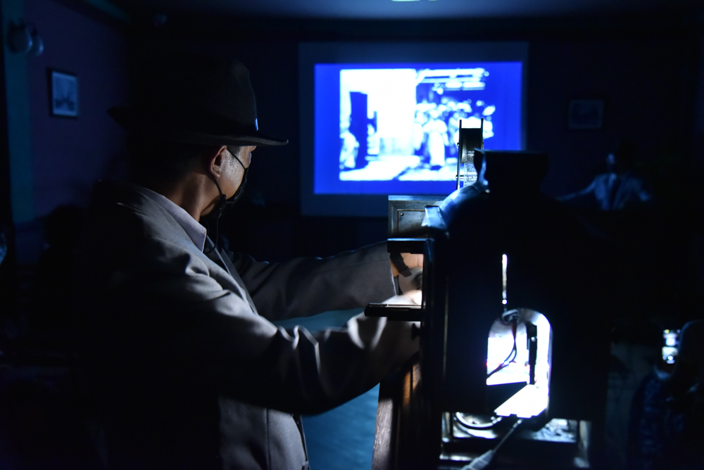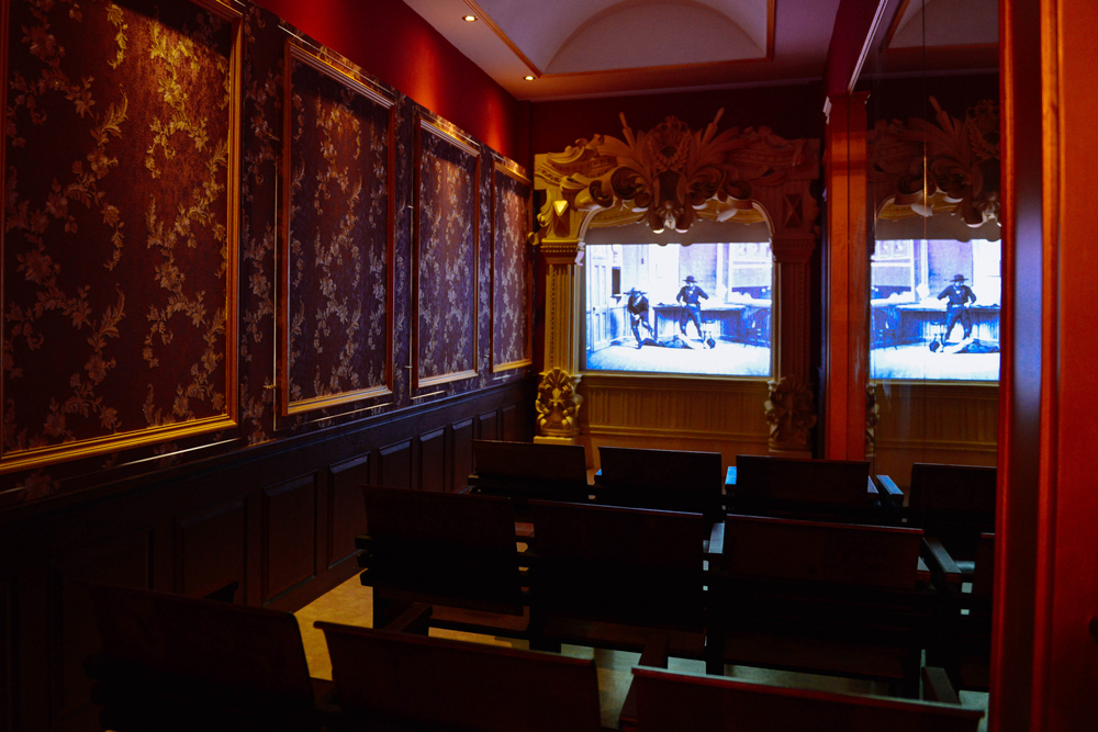 ส่วนจัดแสดงแห่งนี้คือนิทรรศการ การจำลองฉายหนังขึ้นจอครั้งแรกของโลก นักประดิษฐ์สองพี่น้องชาวฝรั่งเศสนามว่า พี่น้องลูมิแอร์ ได้เผยประดิษฐกรรมชิ้นใหม่ของตนให้ชาวโลกได้เห็นในชื่อว่า ซีนีมาโตกราฟ โดยการเช่าสถานที่ห้องโถงใต้ดินร้านกาแฟกร็องด์คาเฟต์ ที่ตั้งอยู่ในโรงแรมสคริบบ์ ที่กรุงปารีส ประเทศฝรั่งเศส ในคืนวันที่ 28 ธันวาคม พ.ศ.2438 หรือปีค.ศ.1895 ในค่ำคืนนั้นมีคนเข้าชมเพียง 33 คนเท่านั้น โดยในห้องนี้ได้จำลองบรรยากาศการชมภาพยนตร์ที่ฉายขึ้นจอและเก็บค่าเข้าชมตามธรรมเนียมของการดูภาพยนตร์ในโรงภาพยนตร์ภายในค่ำคืนดังกล่าวจริงๆ เพื่อให้ทุกท่านได้สัมผัสและดื่มด่ำไปกับความรู้สึกนั้นในวันแรกที่ถือได้ว่าเป็นวันเกิดภาพยนตร์โลก