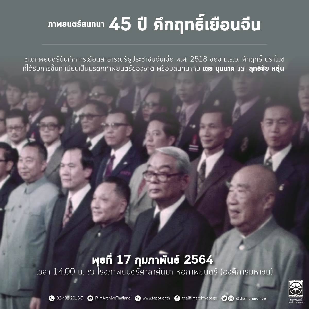 ชมภาพยนตร์ที่เพิ่งได้รับการขึ้นทะเบียนให้เป็นมรดกภาพยนตร์ของชาติ บันทึกการเดินทางเยือนสาธารณรัฐประชาชนจีนของ ม.ร.ว. คึกฤทธิ์ ปราโมช เมื่อ พ.ศ. 2518 ซึ่งถือเป็นหนึ่งในหน้าประวัติศาสตร์การต่างประเทศที่สำคัญที่สุดของไทยและโลก ในช่วงปลายสงครามเย็น เและเป็นจุดเริ่มต้นของสัมพันธไมตรีทางการทูตระหว่างไทยกับจีน พร้อมสนทนากับ "เตช บุนนาค" หนึ่งในคณะทำงานที่รัฐบาลไทยส่งให้ไปเจรจาสถาปนาความสัมพันธ์ที่จีนก่อนหน้าการเดินทางของ ม.ร.ว.คึกฤทธิ์ ปราโมช ซึ่งต่อมาเป็นเอกอัครราชทูตไทย ประจำสาธารณรัฐประชาชนจีน ระหว่าง พ.ศ. 2529 – 2533 และ "สุทธิชัย หยุ่น" ผู้ร่วมเดินทางไปในฐานะคณะผู้สื่อข่าวไทย