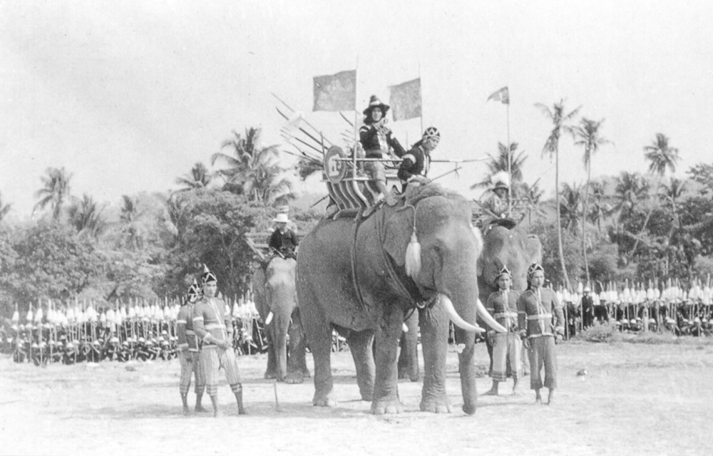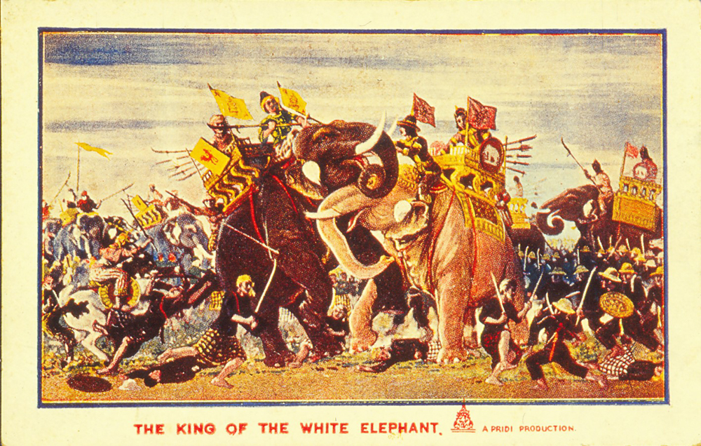 แต่สำหรับโลกภาพยนตร์ เมื่อออกฉายครั้งแรกรอบปฐมทัศน์โลกในกรุงเทพ ที่ห้องฉายเล็กโรงภาพยนตร์ศาลาเฉลิมกรุง วันที่ 4 เมษายน พ.ศ. 2484 คงฉายเป็นภาพยนตร์พูดภาษาอังกฤษตามปกติ แต่ต่อมาเมื่อเข้าฉายตามโปรแกรมปกติ ตั้งแต่วันที่ 10 ถึง 16 เมษายน ปรากฏว่าได้จัดฉายในแบบพากย์ไทย โดยนักพากย์ฝีปากเอกขณะนั้น คือ “ทิดเขียว” (นายสิน สีบุญเรือง) ซึ่งใช้วิธีการพากย์หรือพูดเสียงของบทเจรจาทั้งหมดเป็นภาษาไทย และพากย์กันสด ๆ ในห้องพากย์ ซึ่งอยู่ข้าง ๆ ห้องฉายในโรงภาพยนตร์ นี่แสดงว่าหลังจากเปิดฉายปฐมทัศน์แล้ว ท่านเจ้าของภาพยนตร์คงเห็นว่า ผู้ชมภาพยนตร์ชาวไทยส่วนใหญ่ไม่สามารถเข้าถึงภาพยนตร์ของท่านได้ จึงต้องจัดให้มีการพากย์ขึ้น หรือมิเช่นนั้นก็เป็นไปได้ว่า อาจมีการวางแผนไว้ล่วงหน้าแล้วว่า เมื่อออกฉายในประเทศไทยจะใช้วิธีการพากย์ไทย และเช่นนี้ก็คงจะมีการทำบทพากย์ไทยไว้แล้ว จึงไม่น่าเป็นห่วงว่าผู้ชมชาวไทยจะไม่สามารถชื่นชมภาพยนตร์เรื่องนี้ ยิ่งไปกว่านั้น ข้อความโฆษณาฉายภาพยนตร์เรื่องนี้ในหน้าหนังสือพิมพ์รายวันสมัยนั้น ซึ่งป่าวร้องว่า พากย์โดย “ทิดเขียว” ยังอวดสรรพคุณว่า ไม่เพียงแต่พระเจ้าช้างเผือก หรือพระเจ้าจักรา กษัตริย์อโยธยา จะพูดภาษาไทยเป็นปกติแล้ว พระเจ้าหงสา กษัตริย์หงสาก็พูดไทยชัดด้วย อีกทั้งช้างม้าที่ยกทัพมาปรากฏโฉมในหนังก็พูดภาษาไทยได้หมดด้วย และต่อมาเมื่อภาพยนตร์ออกไปฉายตามต่างจังหวัด ทั่วประเทศ ก็เชื่อว่า เป็นการฉายแบบพากย์ไทยสด ๆ และช้างม้าพลอยพูดได้ไปด้วยกันทั้งนั้น