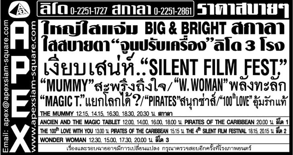 *ตัดทอนเนื้อหาบางส่วนมาจากบทความ “ตำนานการเปลี่ยนผันของโรงหนังเครือเอเพ็กซ์” ในจดหมายข่าวหหอภาพยนตร์ ฉบับที่ 45 พฤษภาคม-มิถุนายน 2561