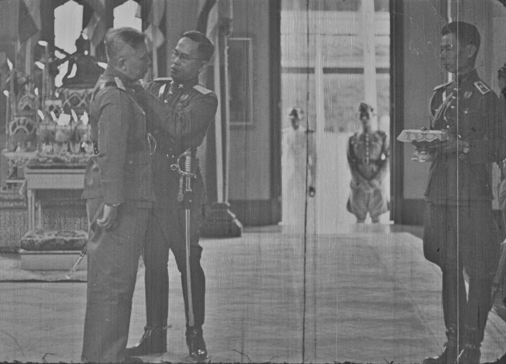 ภาพยนตร์บันทึกเหตุการณ์พิธีประดับยศให้แก่นายทหารและตำรวจชั้นสัญญาบัตรหลายนาย ณ ทำเนียบ วังสวนกุหลาบ ที่สันนิษฐานว่าถ่ายทำขึ้นในปี 2484 หลังไทยได้รับชัยชนะเหนือฝรั่งเศสในสงครามกรณีพิพาทอินโดจีน จากเสียงบรรยายในตอนต้นของหนังที่พูดถึงการได้รับชัยชนะในสงครามและตำแหน่งของนายพลตรีหลวงพรหมโยธีที่ยังอยู่ในช่วงดำรงตำแหน่งรัฐมนตรีช่วยว่าการกระทรวงกลาโหม โดยการประดับยศในครั้งนี้สันนิษฐานว่าเป็นไปเพื่อสนองความดีความชอบให้แก่นายทหารและตำรวจจากผลของสงคราม ที่ทำให้เราได้เห็นภาพของข้าราชการคนสำคัญในฝ่ายนี้หลายคนที่ยังคงมีบทบาทต่อมาในช่วงที่นายพลตรีหลวงพิบูลสงครามกลับมาเป็นนายกรัฐมนตรีครั้งที่ 2 ทั้งยังมีภาพการรับประทานอาหารร่วมกันหลังพิธีประดับยศระหว่างนายพลตรีหลวงพิบูลสงครามกับนายควง อภัยวงศ์ ในสมัยที่ยังอยู่ฟากฝั่งเดียวกัน แต่นอกเหนือไปจากนั้นภาพยนตร์เรื่องนี้ยังสะท้อนให้เห็นถึงความสำเร็จในแบบฉบับของรัฐทหารที่ยศถาบรรดาศักดิ์คือค่านิยมสำคัญและต้องถูกนำเสนอโดยใช้ภาพยนตร์เป็นเครื่องมือ