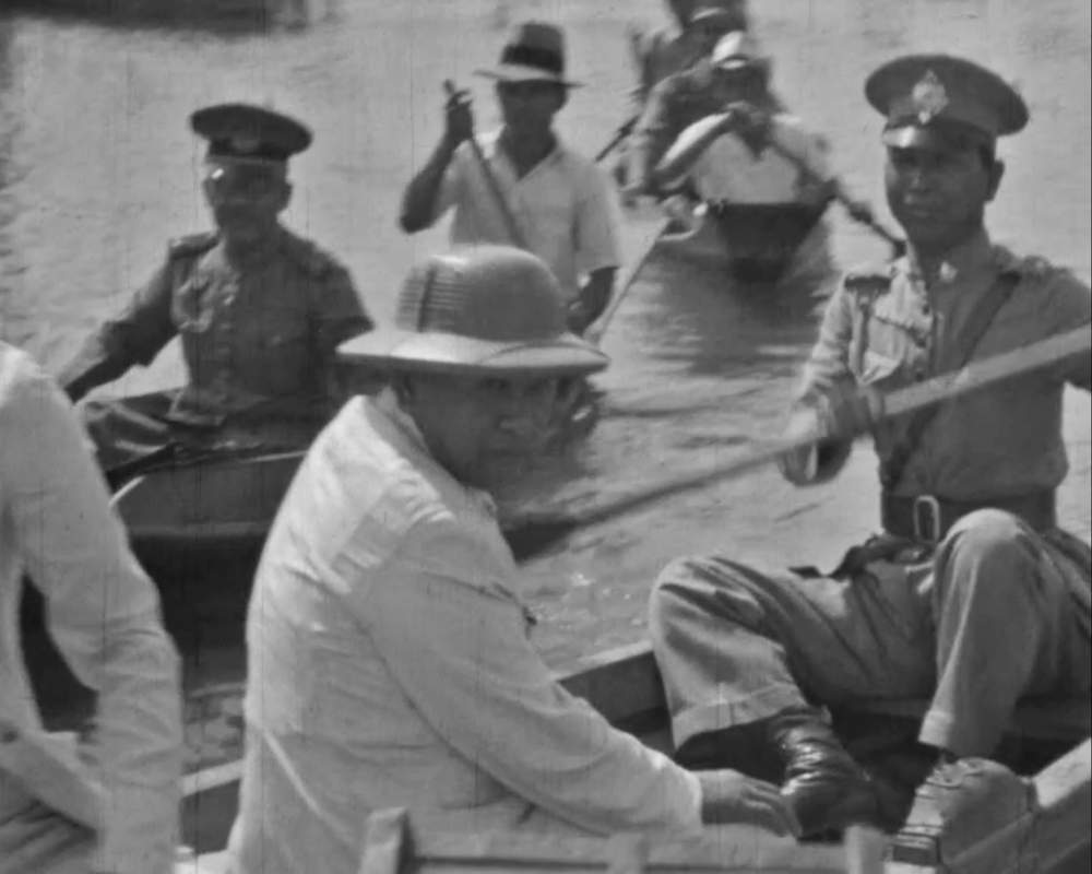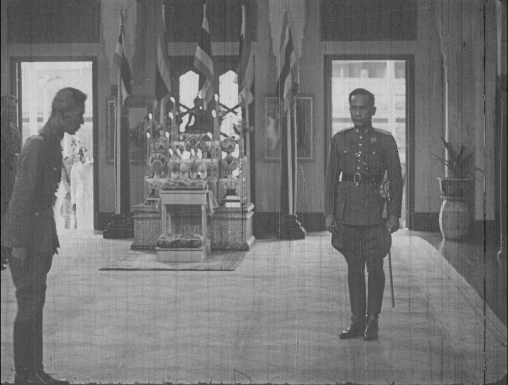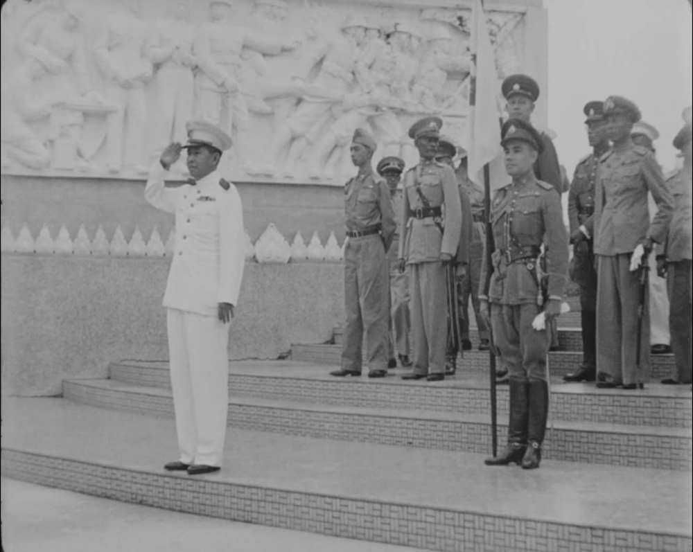 ภาพ : จอมพล ป. พิบูลสงคราม ในภาพยนตร์เรื่อง พิธีประดับยศนายทหารสมัยนายพลตรีหลวงพิบูลสงคราม ๒๔๘๔ (ชมภาพยนตร์ คลิก )