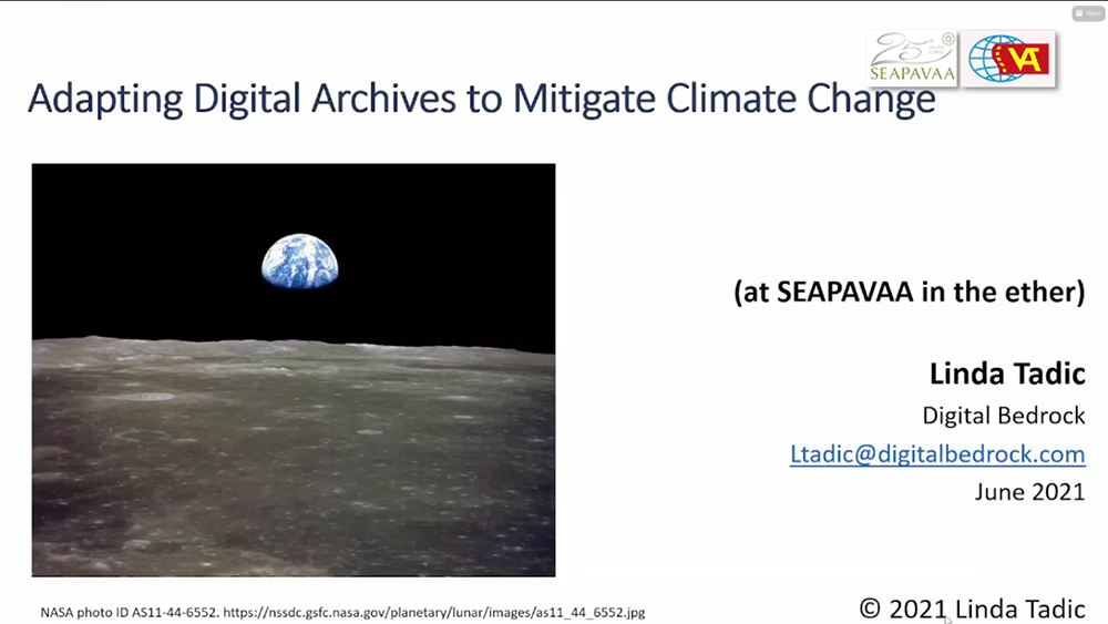 งานประชุมสามัญประจำปีทางออนไลน์ของสมาคมอนุรักษ์สื่อโสตทัศน์แห่งเอเชียตะวันออกเฉียงใต้และแปซิฟิกครั้งที่ 25 (SEAPAVAA’s virtual 25th Conference) ที่มีขึ้นระหว่างวันที่ 23-25 มิถุนายน ได้รับเกียรติจาก ลินดา ทาดิค (Linda Tadic) CEO ของบริษัท Digital Bedrock เป็นองค์ปาฐก บรรยายเปิดงานในหัวข้อ Adapting Digital Archives to Mitigate Climate Change หรือ “การปรับตัวของงานอนุรักษ์แบบดิจิทัลเพื่อลดผลกระทบของการเปลี่ยนแปลงสภาพภูมิอากาศ” หัวข้อการบรรยายนี้เป็นประเด็นร่วมสมัยที่ผสานหลักการงานอนุรักษ์ภาพยนตร์ เข้ากับประเด็นร้อนเรื่องการอนุรักษ์สิ่งแวดล้อม ซึ่งดูเผิน ๆ เหมือนจะเป็นสองภารกิจที่ไม่มีอะไรเกี่ยวข้องกัน แต่แท้จริงแล้วมีความสัมพันธ์เชื่อมโยงแนบแน่น โดยเฉพาะอย่างยิ่งในโลกยุคหลังโควิด-19