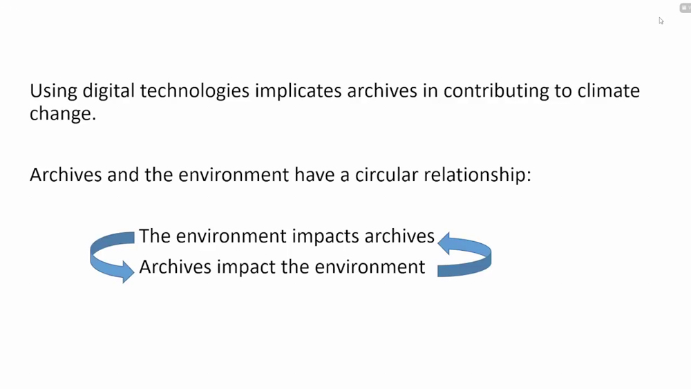 ทาดิคกล่าวว่า ความสัมพันธ์ระหว่างภาวะภูมิอากาศเปลี่ยนแปลงและงานอนุรักษ์สื่อโสตทัศน์ จึงส่งผลสะท้อนกลับไปมาซึ่งกันและกัน งานอนุรักษ์แบบดิจิทัลเพิ่มมลภาวะให้โลก และเมื่อโลกระส่ำระสาย หน่วยงานอนุรักษ์ก็มีปัจจัยเสี่ยงเพิ่มขึ้น วนเวียนไปเช่นนี้