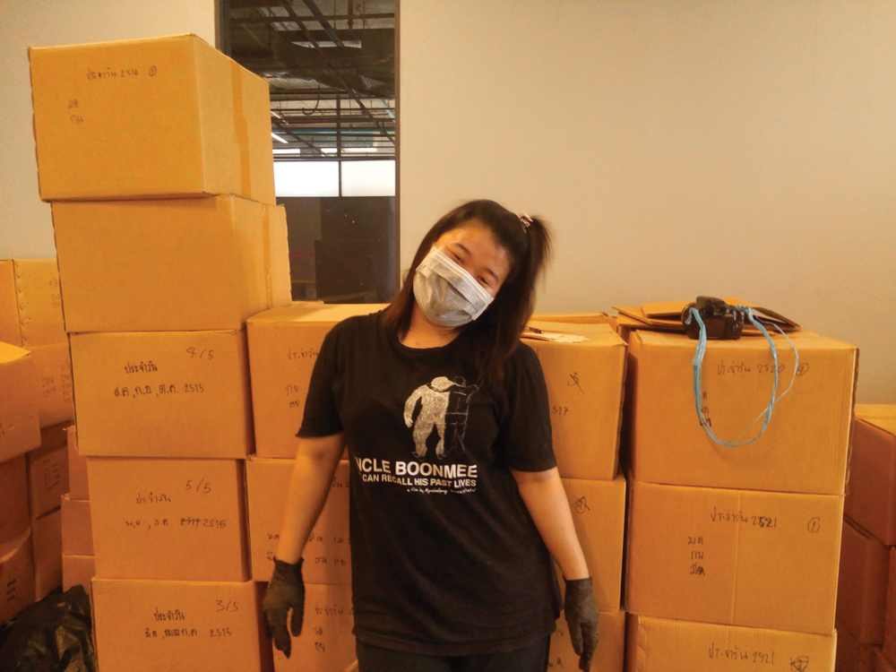 ก่อนที่จะเริ่มทำงานที่นี่ พี่เขาบอกว่าให้มาลองทำ 1 วันก่อน ว่าเราสามารถทนกับกลิ่นที่เหม็นได้ไหม สัมผัสกับสารเคมีได้ไหม ทนกับการที่เราต้องนั่งจ้องฟิล์มเป็นวัน ๆ ได้ไหม จนเมื่อทำงานตรวจฟิล์มทั้ง 8, 16 และ 35 มม. มาได้สักพัก คำตอบก็คือทนได้ แต่งานอนุรักษ์ฟิล์มไม่ได้มีแค่นั้น ช่วงนั้นเกิดน้ำท่วม ทำให้พวกเราต้องช่วยกันขนย้ายฟิล์มไปที่ที่ปลอดภัย ตอนนั้นก็คิดว่าหนักแล้ว เพราะมีทั้งสนิม ฝุ่น และน้ำหนักของฟิล์ม แต่พวกเราก็ผ่านมันมาได้โดยที่ฟิล์มไม่ได้รับความเสียหาย หลังจากนั้นพวกเราก็ได้รับภารกิจเคลียร์ฟิล์มที่โกดังซึ่งมหาศาลมาก ให้ฟิล์มมาอยู่ในระบบที่สามารถค้นหาได้ ปัญหาอุปสรรคที่โกดังก็มีมากมาย ความสะดวกสบายไม่ได้เหมือนอยู่ออฟฟิศ ด้วยอากาศที่ร้อน ฝุ่น รา สนิมที่มาจากกล่องฟิล์ม การขนย้ายฟิล์มที่ต้องใช้แรงจากพวกเราเท่านั้น