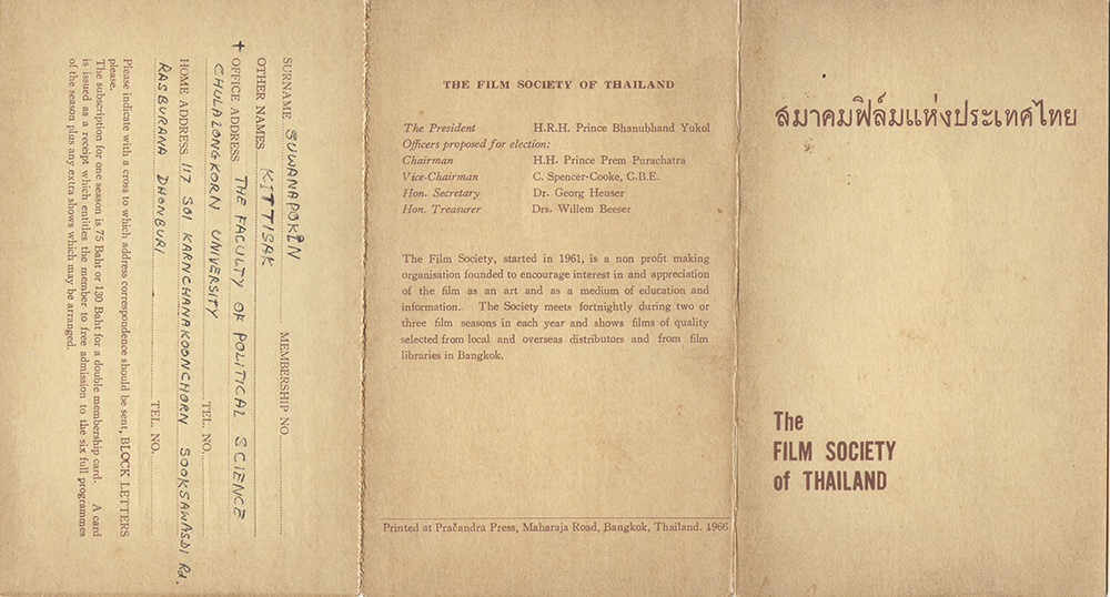 Film Society of Thailand ก่อตั้งขึ้นเมื่อปี 2504 โดยมี พระเจ้าวรวงศ์เธอ พระองค์เจ้าภาณุพันธุ์ยุคล เป็นนายกสโมสร พระวรวงศ์เธอ พระองค์เจ้าเปรมบุรฉัตร เป็นประธานกรรมการ คณะกรรมการเท่าที่ดูจากรายชื่อ เป็นเจ้าหน้าที่ชั้นผู้ใหญ่จากสถานทูตต่างประเทศในเมืองไทย มีทั้งอังกฤษ ฝรั่งเศส และเยอรมัน กิจกรรมสำคัญของสมาคมก็คือ จัดฉายหนังนานาชาติที่หาดูได้ยากทั้งเก่าและใหม่ ปีละสองครั้ง เข้าใจว่าจะไม่มีการเก็บค่าสมาชิก นอกจากค่าดูหนังโปรแกรมละ 75 บาท (6 เรื่อง) หนังที่นำมาฉายก็ได้รับการสนับสนุนจากสถานทูต สถาบันวัฒนธรรม และตัวแทนบริษัทหนังในเมืองไทยขณะนั้น