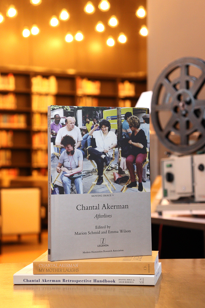 ส่วนปกหน้าของหนังสือ Chantal Akerman: Afterlives ที่มีภาพ ชองทาล อัคเคอร์มาน ขณะอยู่ในกองถ่ายภาพยนตร์ Un divan à New York (1996) บรรณาธิการโดย มารียง ชมิด (Marion Schmid) และ เอ็มมา วิลสัน (Emma Wilson) เป็นหนังสือที่รวบรวมบทความเชิงวิชาการเอาไว้มากกว่าหนังสืออีกสองเล่มข้างต้น อีกทั้งภาษาที่ใช้เขียนเกี่ยวกับทฤษฎีภาพยนตร์ก็มีลักษณะที่หลากหลายมาก เช่น บทความ Smokescreens: Notes On Cigarettes in Chantal Akerman ของนักวิชาการ อลิส แบล็กเฮิร์สต์ (Alice Blackhurst) เรื่องฉากสูบบุหรี่ในภาพยนตร์เรื่องต่าง ๆ ของชองทาลว่า บุหรี่ใช้สะท้อนความเป็นแม่ที่มีความซับซ้อนและย้อนแย้ง บุหรี่ใช้บ่งชี้ถึงหนทางที่เต็มไปด้วยความยากลำบากอันเป็นต้นตอของความรู้สึกของคนเป็นแม่ที่มีทั้งสุขและทุกข์ในเวลาเดียวกัน การสูบบุหรี่ในภาพยนตร์ของชองทาลไม่ใช่แค่พฤติกรรม แต่เป็น “ภาษากาย” ที่สื่อถึงความเป็นตัวของตัวเอง โดยเฉพาะในบริบทของผู้หญิงที่เป็นแม่ และเป็นการต่อต้านบทบาทแม่แบบดั้งเดิม การสูบบุหรี่กลายเป็นช่วงเวลาส่วนตัวที่เธอ “อยู่กับตัวเอง” ด้วยท่าทางการจุดไฟ การพ่นควัน การหยุดนิ่ง ทั้งหมดนี้เป็น “ท่วงทำนอง” ที่ชองทาลใช้ในการสร้างภาพของผู้หญิงที่มีความลึกซึ้งและไม่จำเป็นต้องพูด รวมถึงเป็นการสร้างพื้นที่ให้ผู้หญิงมีสิทธิ์ในความเงียบ ความลึกลับ ความพึงพอใจส่วนตัว โดยไม่ต้องถูกตีความหรืออธิบาย