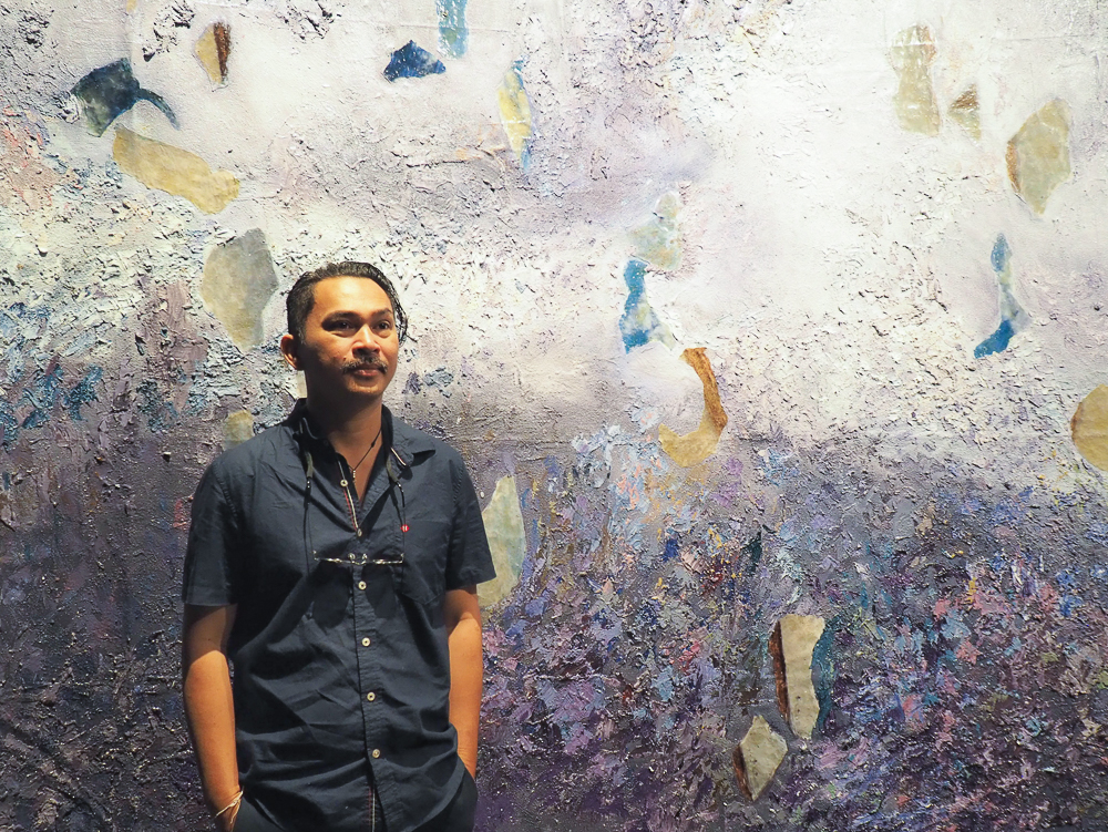 ชีวิตประจำวันส่วนใหญ่ผมชอบขี่มอเตอร์ไซค์ไปดูแลนด์สเคปอยู่แล้ว การเกิดขึ้นของงานชิ้นนี้คือมีวันหนึ่งที่ผมไปแถวร้อยเอ็ด แล้วไปคุยกับชาวบ้าน มีประโยคหนึ่งที่เขาบอกว่า “ฝนจะมาแล้ว” เขาก็แหงนหน้ามองบนท้องฟ้า “ฝนจะมาแล้วต้องรีบเตรียมไม่ให้น้ำท่วม” เราก็เลยเกิดไอเดียว่าระหว่างกลางดินกับฟ้า มันมีแรงกดอากาศอะไรบางอย่างอยู่ เลยเขียนรูปท้องฟ้าขึ้นมาเพื่อจะเปลี่ยนท้องฟ้าจากอากาศที่มีมวลเบานุ่มเป็นท้องฟ้าที่มีความหนัก อีกส่วนหนึ่งคือผมชอบไปไหว้พระ แล้วมีพระรูปหนึ่งพูดประโยคนี้ขึ้นมา “มัวแต่คอยบุญวาสนาไม่ได้ ต้องขยัน”