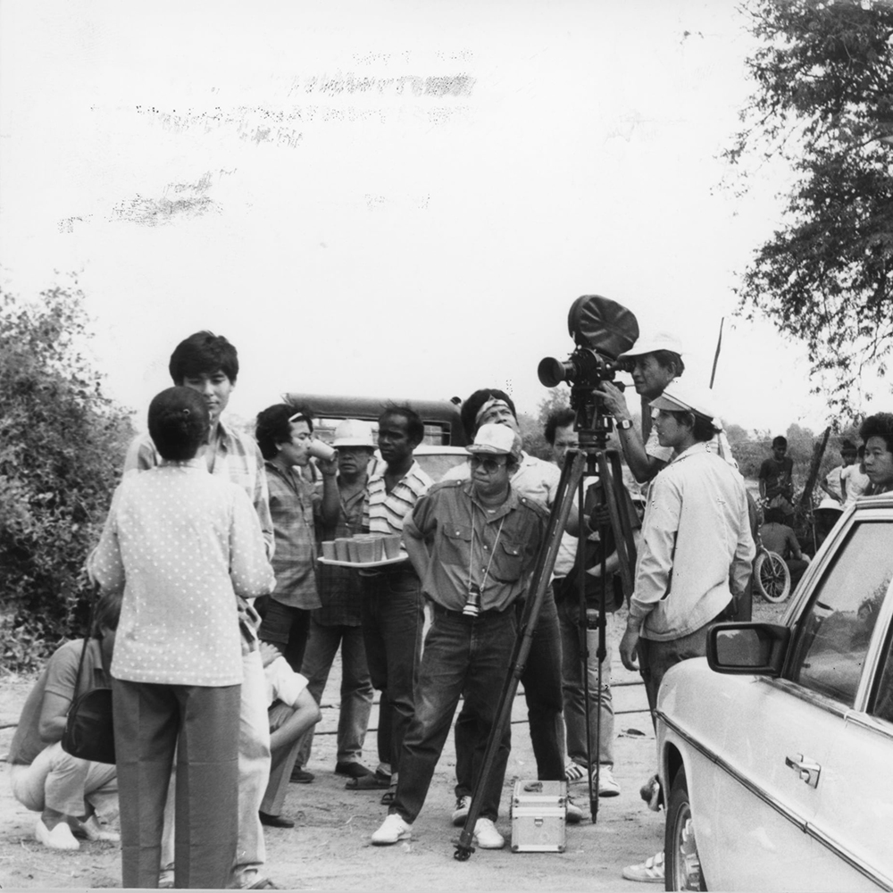ภาพ: สมพงษ์ ตรีบุบผา (กลาง) ในกองถ่ายภาพยนตร์เรื่อง "ยุ่งนักรักซะเลย" (2529)