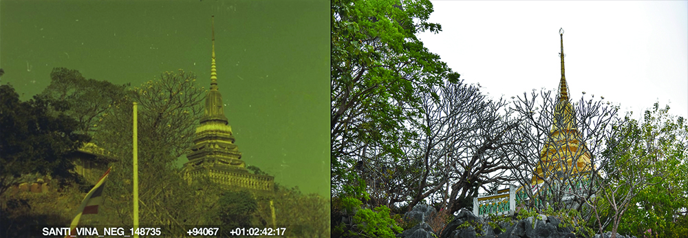 ภาพ: เจดีย์ในวัดบุญทวี ในภาพยนตร์เทียบกับภาพเจดีย์ในปัจจุบัน