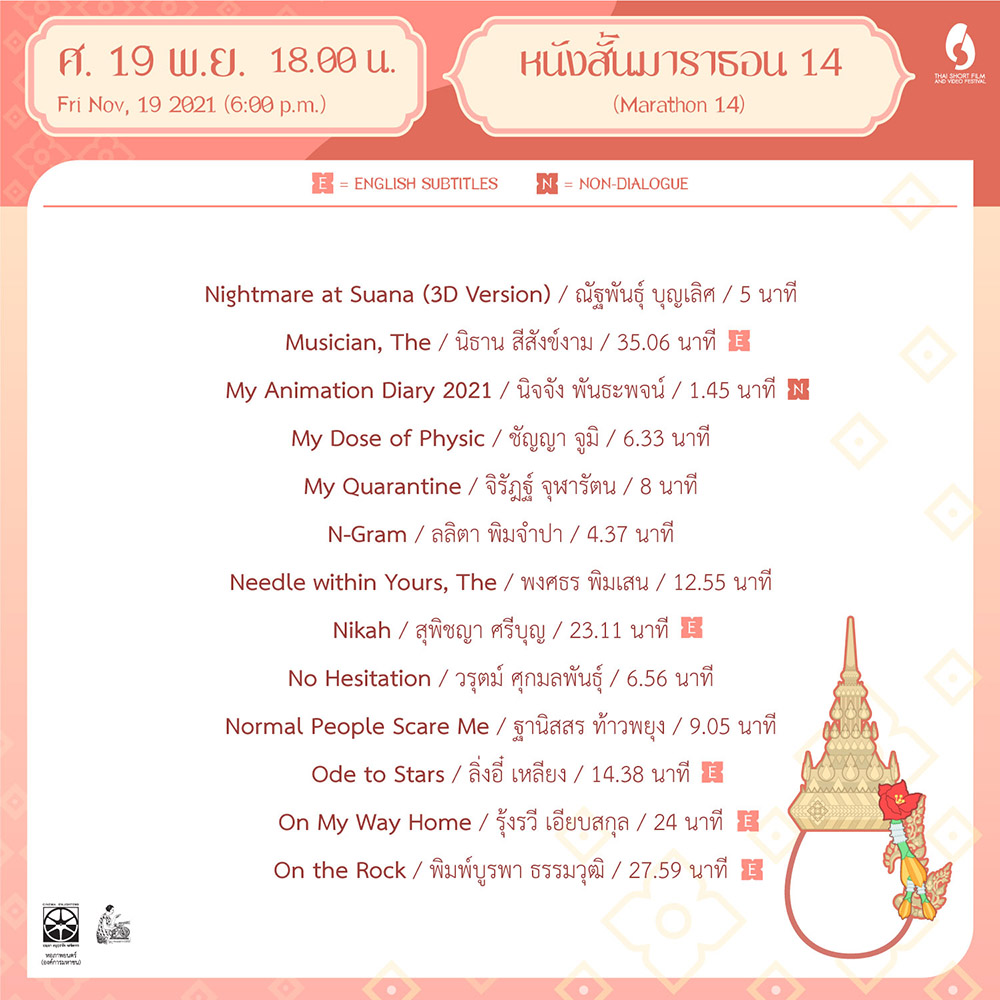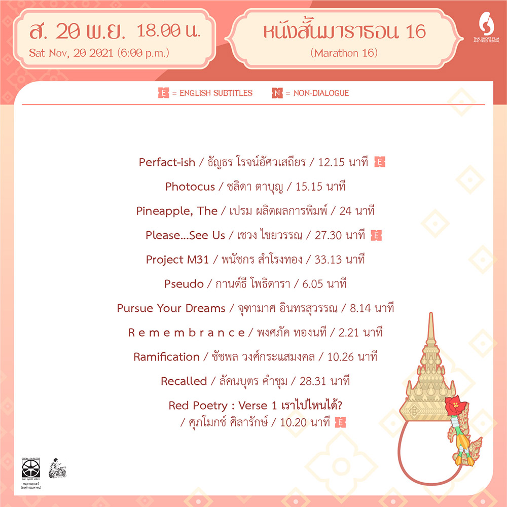“หนังสั้นมาราธอนออนไลน์” จะจัดฉายระหว่างวันที่ 12 พฤศจิกายน - 4 ธันวาคม 2564 (หยุดทุกวันพุธ) เวลา 13.00 - 16.00 น. และ 18.00 - 21.00 น. (วันละ 2 โปรแกรม โปรแกรมละประมาณ 3 ชั่วโมง) โดยจัดเรียงการฉายตามลำดับพยัญชนะแรกของชื่อเรื่อง ผ่านทางโปรแกรม Zoom