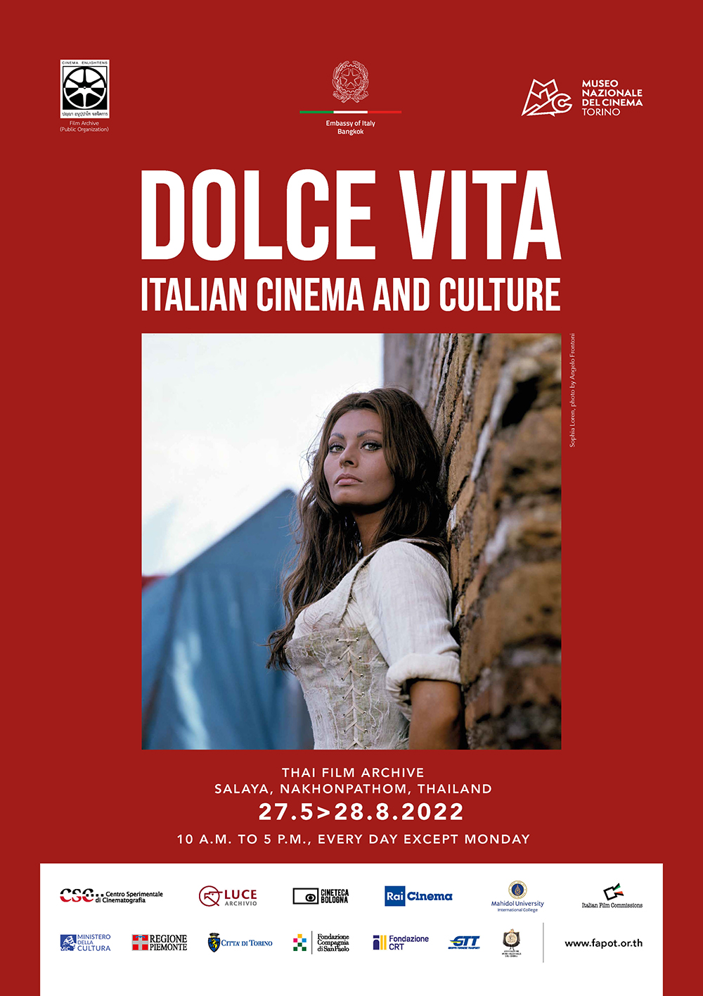 Dolce Vita: Italian Cinema and Culture เป็นส่วนหนึ่งของการเฉลิมฉลองปีที่ 76 ของสาธารณรัฐอิตาลี (76th Day of the Italian Republic) งานแสดงจะมีขึ้นที่ห้องนิทรรศการชั้น 3 อาคารสรรพสาตรศุภกิจ หอภาพยนตร์ (องค์การมหาชน) ตั้งแต่วันที่ 27 พฤษภาคม – 28 สิงหาคม 2565