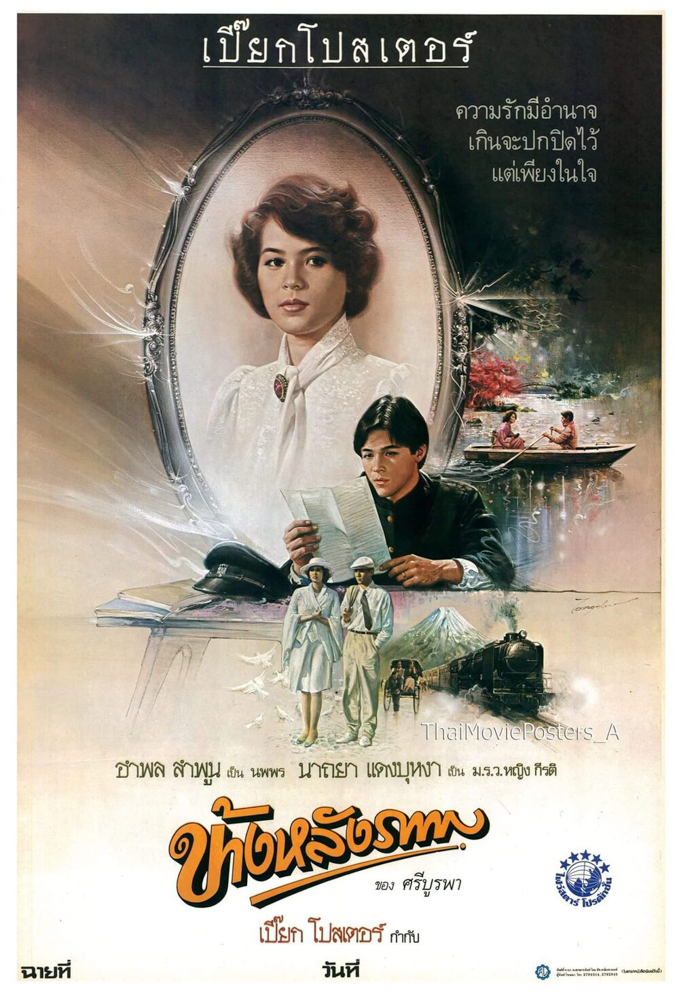 ข้างหลังภาพ เป็นบทประพันธ์ของศรีบูรพา ในฉบับปี 2528 กำกับภาพยนตร์โดย เปี๊ยก โปสเตอร์ โดยได้ยกกองไปถ่ายทำที่ประเทศญี่ปุ่นเกือบตลอดทั้งเรื่อง เรื่องราวของนพพรเป็นนักศึกษาในประเทศญี่ปุ่น เจ้าคุณอธิการบดี ได้เดินทางมาเที่ยวประเทศญี่ปุ่นพร้อมภรรยา นพพรได้พบกับ ม.ร.ว.กีรติ ด้วยความกังวลว่า ม.ร.ว.กีรติ จะรู้สึกเบื่อ เจ้าคุณอธิการบดีจึงได้ฝากให้นพพร พา ม.ร.ว.กีรติ ไปเที่ยวชมสถานที่ต่าง ๆ ในญี่ปุ่น ความใกล้ชิดกัน ทำให้นพพรเกิดความรู้สึกพิเศษต่อ ม.ร.ว.กีรติ แม้จะรู้ว่า ม.ร.ว.กีรติ ได้แต่งงานแล้วก็ตาม นพพรได้สารภาพความในใจกับ ม.ร.ว.กีรติ แต่เธอได้ปฏิเสธนพพร โดยให้เหตุผลถึงความเหมาะสม 6 ปีผ่านไป นพพรได้เดินทางกลับสยาม ขณะที่เจ้าคุณอธิการบดีได้ถึงแก่กรรม และ ม.ร.ว.กีรติ ได้กลายเป็นหม้าย นพพรได้พบกับเธออีกครั้ง แต่ความรู้สึกของเขาที่มีต่อเธอได้เปลี่ยนไป
