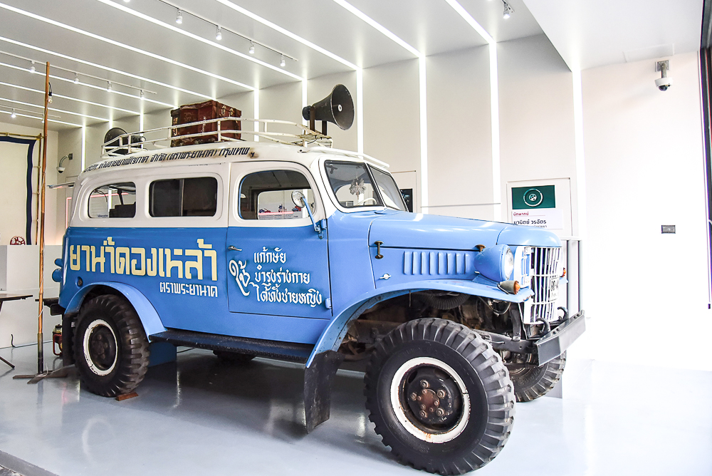 นิทรรศการรถหนังขายยา นิทรรศการที่จัดแสดงรถหนังขายยา พร้อมประดับตกแต่งพื้นที่ที่มีหน้าตาออกมาในแนว “การาจ” ซึ่งคอนเซปต์ของการออกแบบนั้น ได้แรงบันดาลใจมาจากการผสมผสานความเป็นอู่รถและโชว์รูมรถยนต์ โดยการประดับเส้นแสงภายในให้ดูล้ำสมัย ซึ่งสื่อถึงการเชื่อมโยงอดีตกับปัจจุบัน ภายในชุดนิทรรศการรถหนังขายยาประกอบไปด้วย 3 ส่วนหลัก